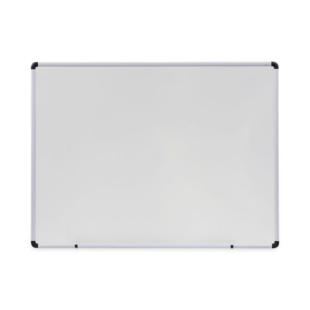 Stylish, durable, high-quality, wall-mountable dry erase board is an indispensable office addition that's perfect for occasional use. Melamine surface accepts all dry-erase markers and wipes clean with cloth, eraser, or dry erase wipes. Modern, contoured aluminum frame features attractive, protective, black, rounded, plastic corners. Extra-wide marker/eraser tray. May be mounted vertically or horizontally. Dry erase markers and erasers sold separately. Board Type: Dry Erase; Board Width: 48"; Board Height: 36"; Surface Material: Melamine.