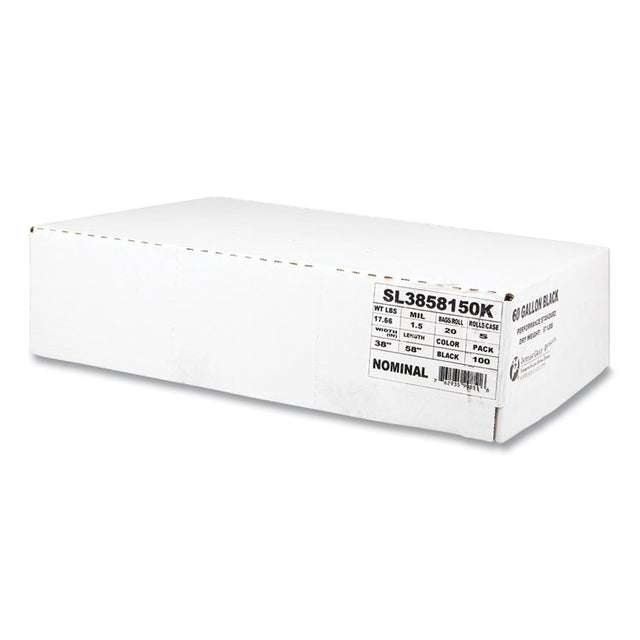 Low-Density Commercial Can Liners, 60 gal, 1.5 mil, 38 x 58 , Black, Interleaved Roll, 20 Bags/Roll, 5 Rolls/Carton