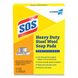 S.O.S Steel Wool Soap Pads are tough so you dont have to be. Made with durable steel wool and saturated with long-lasting soap, these pads cut through even the toughest baked-on, greasy, grimy messes. They are perfect for cleaning ovens, broilers, cookie sheets and pots and pans. The durable and long-lasting design is made for the toughest jobs and can remove baked-on food from pots or pans. These reusable steel wool soap pads are great outside the kitchen, too. From scrubbing stoves and shower doors to cleaning grills and golf clubs, these pads quickly remove stubborn grease, rust and stains inside and outside the home or workplace. The soap contains rust inhibitors, preservatives, biodegradable soaps and detergents, a pH buffer, fragrance and color. Makes aluminum, iron and stainless steel pots and pans sparkle. Cleaning is quick and easy with S.O.S Steel Wool Soap Pads. Scouring Pads/Sticks Type: Pad; Material(s): Steel Wool; Size (W x L): 2.4 x 3; Color(s): Steel.