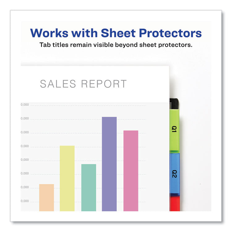 Strong organization and storage capabilities are yours with the help of these Big Tab Two-Pocket Insertable Plastic Dividers. Each divider features double plastic pockets, one on each side of the divider, to provide extra storage space for your important papers. The Big Tab design allows you to use larger fonts or more lines of text than on typical inserts for easier reading or more detailed labeling. Use a free template from Avery Design & Print to customize tabs titles onto the included label sheets using your computer and printer. The tabs' unique design keeps inserts from falling out, so your dividers stay securely labeled. Constructed with durable plastic, these dividers offer lasting organization in a big way. Handwrite or print inserts on laser and inkjet printers. Single-PocketFront pocket for storage. Index Divider Style: Customizable; Index Divider Size: 11.13 x 9.25; Punched/Unpunched: 3-Hole Punched; For Use With: Ring Binders.