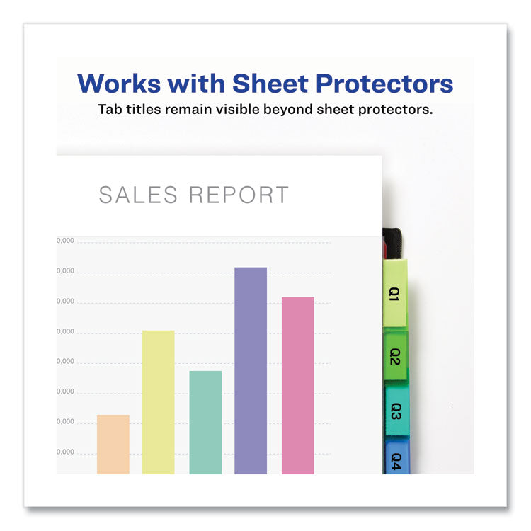 Strong organization and storage capabilities are yours with the help of these Big Tab Two-Pocket Insertable Plastic Dividers. Each divider features double plastic pockets, one on each side of the divider, to provide extra storage space for your important papers. The Big Tab design allows you to use larger fonts or more lines of text than on typical inserts for easier reading or more detailed labeling. Use a free template from Avery Design & Print to customize tabs titles onto the included label sheets using your computer and printer. The tabs' unique design keeps inserts from falling out, so your dividers stay securely labeled. Constructed with durable plastic, these dividers offer lasting organization in a big way. Handwrite or print inserts on laser and inkjet printers. Single-PocketFront pocket for storage. Index Divider Style: Customizable; Index Divider Size: 11.13 x 9.25; Punched/Unpunched: 3-Hole Punched; For Use With: Ring Binders.