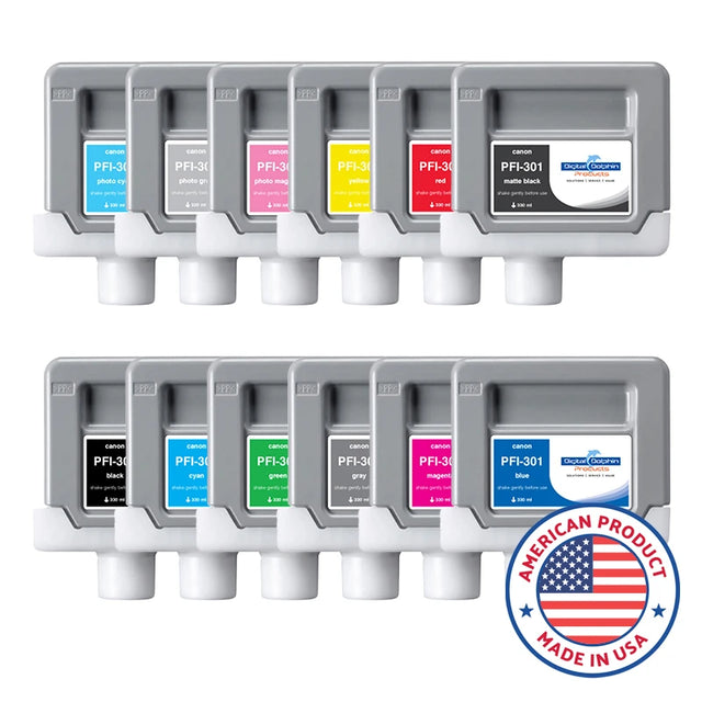 Our PFI-301 compatible cartridges are an ideal substitute for your Canon PFI-301 Ink Cartridges. Our compatible ink is a reliable alternative to the costly OEM, providing consistently sharp lines and OEM-matched color gamut. Flushing is unnecessary when switching from OEM to DDP Inks, which allows plug-and-play printing.100% Satisfaction Guarantee