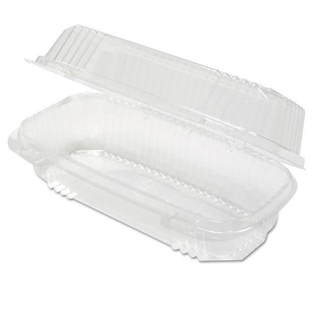 SmartLock system features a tight, audible click closure that helps ensure maximum food freshness. Wide temperature resilience range (20F to 180F) enables placement in freezers and heated display cases. Smooth front panel makes sticker-labeling easy. Strong, rib-reinforced sides and back accommodate heavy items and provide enhanced crush resistance. Break-resistant hinge is flexible enough for easy closure and reliable enough for repeated openings and closings. Hoagie Small. Food Container Type: Hinged Lid Container Material(s): Plastic Food Container Material Type: Plastic Capacity (Volume): 23 oz.