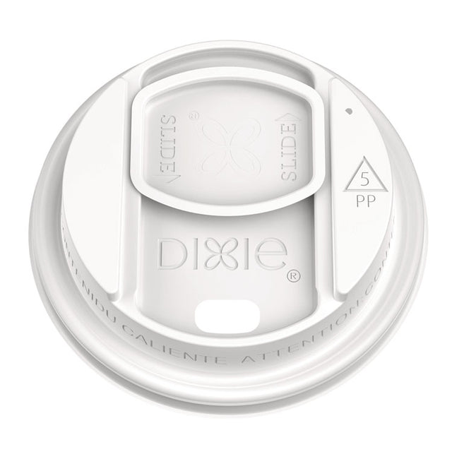 Dixie Large Reclosable Plastic Hot Cup Lids feature a patented sliding tab that helps reduce the risk of beverage splash, even in vehicle cup holders
